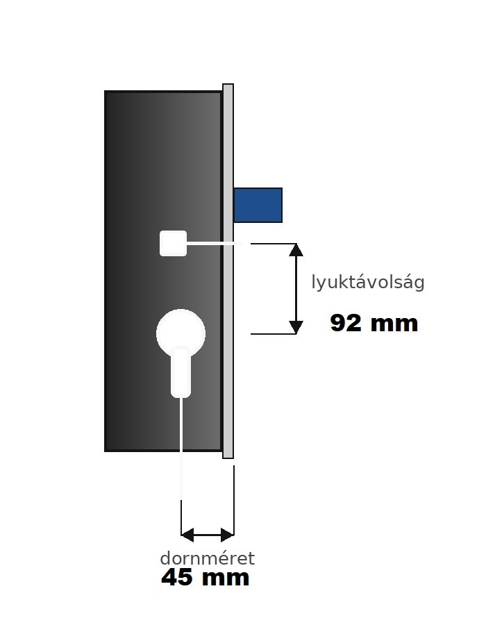 Ez a változat 45 mm dornméretű, 92 mm lyuktávolságú és 16 mm széles előlappal rendelkezik, a kilincsnégyszög mérete pedig 8 mm. Az előlap teljes hossza 2285 mm, a kilincsmagasság 1050 mm. Csere előtt érdemes minden fontos méretet ellenőrizni, elsősorban: a gyártót, a dornméretet, a lyuktávolságot, az előlap szélességét és a záróelemek pozícióját, mivel ezek a paraméterek gyártón és típusonként eltérőek lehetnek.