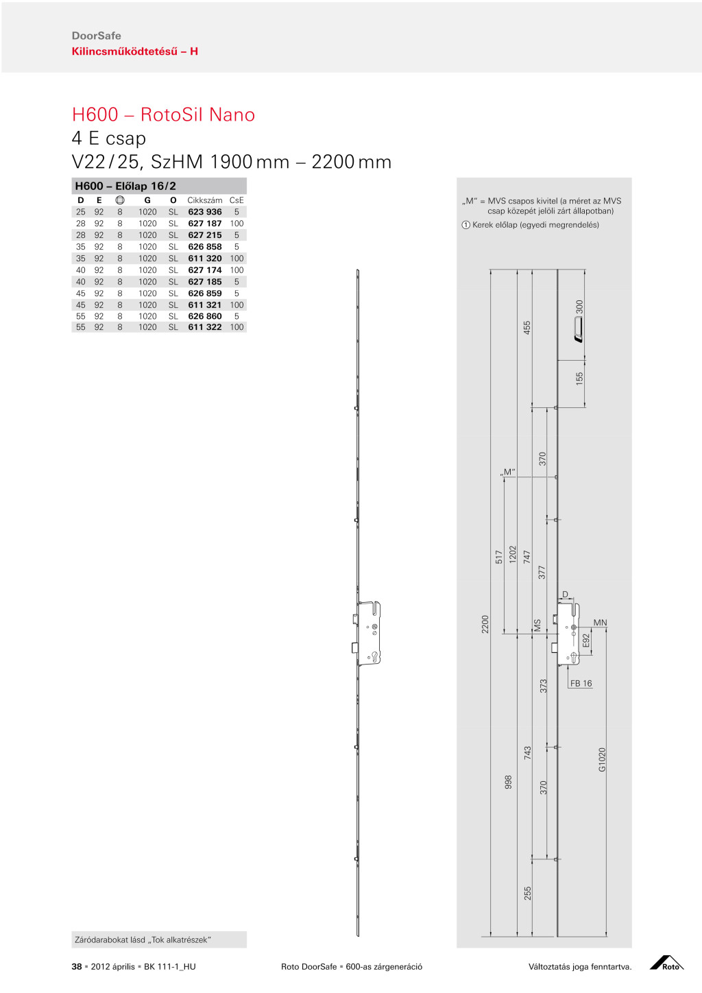 Ez a változat 45 mm dornméretű, 92 mm lyuktávolságú és 16 mm széles előlappal rendelkezik, a görgők átmérője 8 mm a kilincsnégyszög mérete pedig 8 mm. Az előlap teljes hossza 2200 mm, a kilincsmagasság 1020 mm.